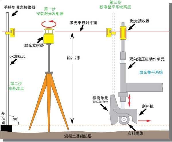 激光整平儀發射激光信號→激光接收器接收到激光信號→激光信號數據傳達到電腦數據處理系統→電腦數據處理系統發送信號到激光整平機上的雙向液壓缸→雙向液壓缸執行命令(刮板、布料螺旋及振搗器沿空間中的激光平面平行運動)→完成激光整平。